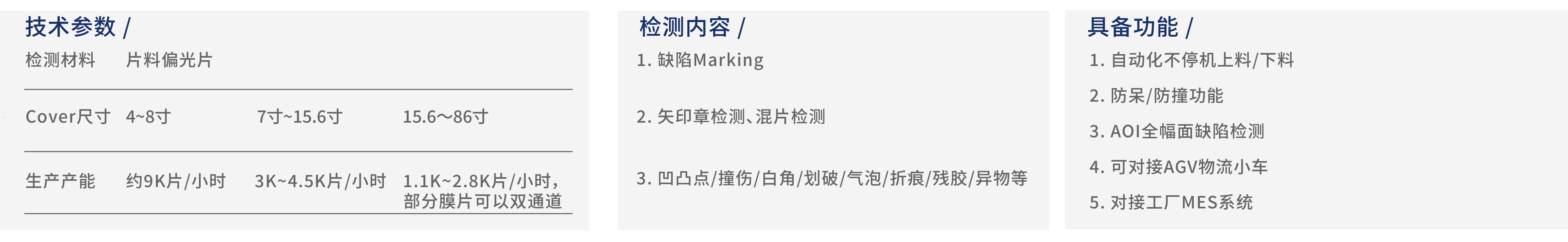 设备用于偏光片的检测,采用自动上下料以及特制输送结构,搭配自研AOI检测软件,对矢印章、缺陷打标Mark、异物、气泡、划伤、凹凸点、折痕、撞伤、残胶、脏污等缺陷进行精准检测以及OK/NG分流,把控出货产品质量。